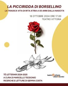 <<L’ho capito da lei che cosa vuol dire avere coraggio. Ho imparato che nella vita non ci si deve inchinare alla prepotenza e che alla giustizia non servono parole tonanti, ma racconti veri, fatti concreti>>. E’ tutto in queste parole luminose, contenute in una lettera indirizzata a Paolo Borsellino, il senso della vita di Rita Atria, la più giovane collaboratrice di giustizia del nostro Paese. Una vita tutt’altro che semplice, intessuta di drammi, speranze e coraggio, e finita in modo drammatico, ma capace di farsi testimonianza viva e imperitura. Un fiore che non smette di emanare bellezza, proteso alla costante ricerca di quel “fresco profumo della libertà” caro a Borsellino. Il 18 ottobre il Teatro Vittoria di Roma ospiterà La picciridda di Borsellino, incontro letterario a cura di Marcello Teodonio, con ricerche e letture di Gemma Costa, dedicato proprio a Rita Atria, che quest’anno avrebbe compiuto cinquant’anni.