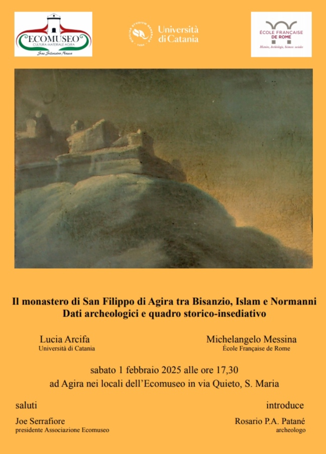Per fare luce sugli aspetti meno noti della storia agirina, l’Associazione Ecomuseo di Cultura materiale di Agira ha promosso, sabato 1 febbraio, un incontro culturale dal titolo Il monastero di San Filippo di Agira tra Bisanzio, Islam e Normanni. Dati archeologici e quadro storico-insediativo. L’evento ha avuto luogo all’interno dell’antica e bella chiesa di Santa Maria Maggiore (nella foto a sinistra il Direttivo dell’Ecomuseo con al centro i due relatori). A fare luce sull’argomento Lucia Arcifa, docente di Archeologia cristiana e medievale all’Università degli Studi di Catania, e Michelangelo Messina, archeologo esperto di Altomedioevo siciliano, membro della sezione Moyen Âge dell’École Française de Rome. L’incontro è stato introdotto dall’archeologo Rosario Patané, già dirigente presso il Dipartimento dei Beni Culturali e dell’Identità Siciliana.